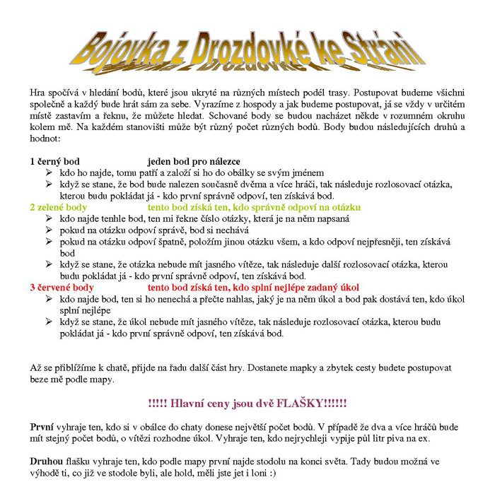 Po obídku a nějakých těch pivkách přijde to, na co se všichni budete moc těšit – bojovka. Samozřejmě vám rozdám pravidla a nějaké ty instrukce a vyrazíme. Poučena z předchozího nezdaru, letos, a myslím, že už navždy, bude první cenou pro vítěze nebo vítězku FLAšKA!